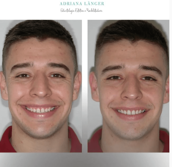 Este é um antes e depois, para mostrar a diferença no sorriso gengival, que é quando a gengiva fica à mostra. Você nota, que na segunda imagem, o paciente ficou com o rosto mais seguro, os dentes mais alongados, muito mais harmônico. ????????